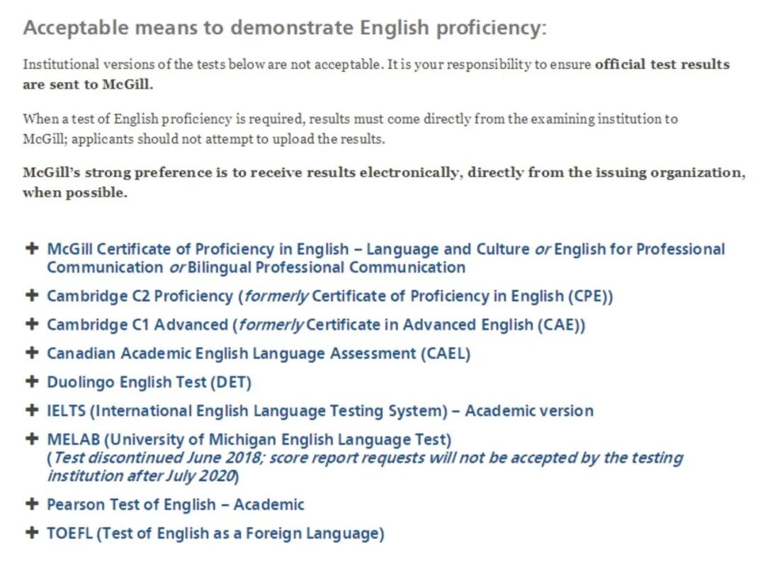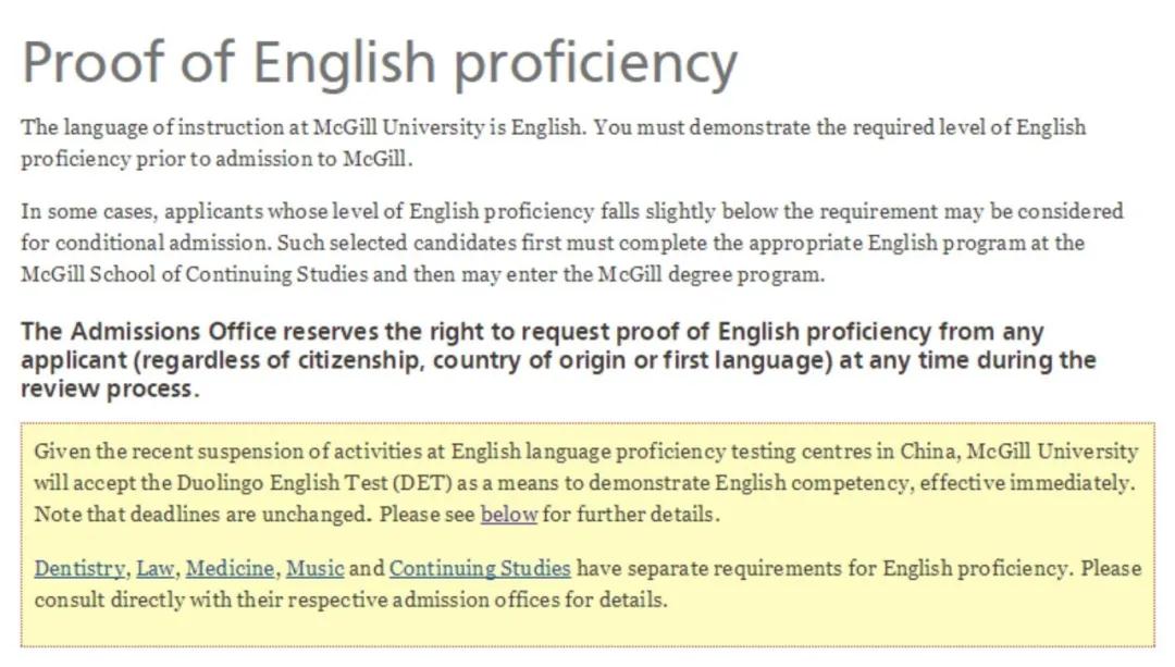 太暖心了,随着疫情持续影响,二三月的雅思托福GRE考试陆续取消,很有可能继续持续到四月份,今年申请季还没有考出语言成绩的同学无疑受到了很大影响,加拿大很多大学如UBC,SFU,McMaster等陆续推迟了递送语言成绩的截止时间,而麦吉尔 M cGill大学则特批DET考试可以作为英语成绩证明,总分达到115-120,可以直接录取!今年麦吉尔大学语言提交的截止日期是3月15日,完全赶得及哦!