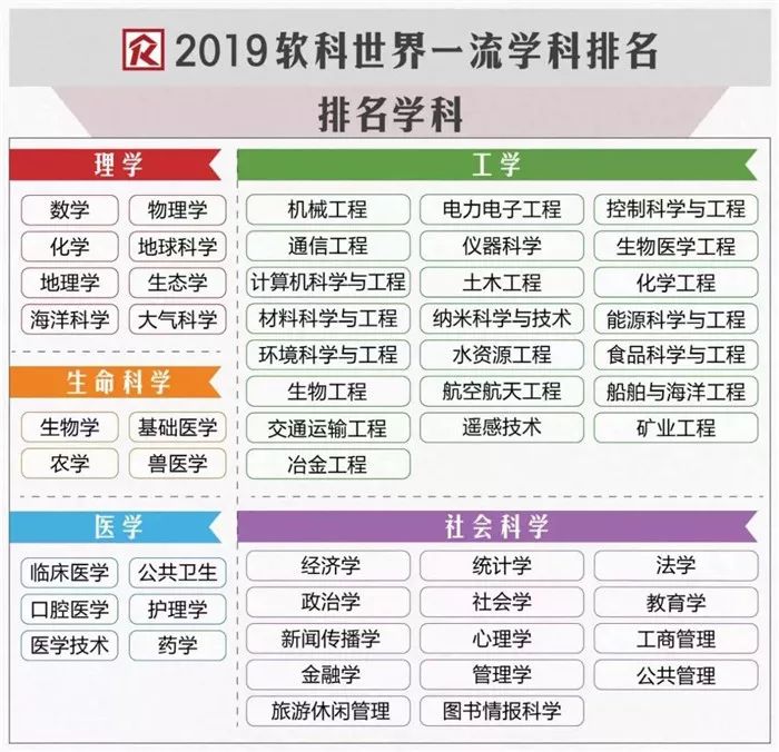 2019年的软科依然是史上最全面的,比QS的48个专业还要多。2019年排名覆盖54个学科,涉及理学、工学、生命科学、医学和社会科学五大领域,堪称良心排名了。