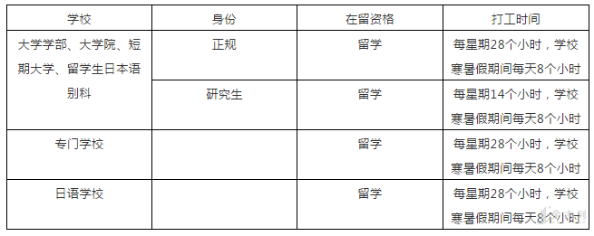 日本法务省根据外国人的签证种类(在留资格)的不同,对于打工时间和打工内容做出了严格的限制。具体如下: