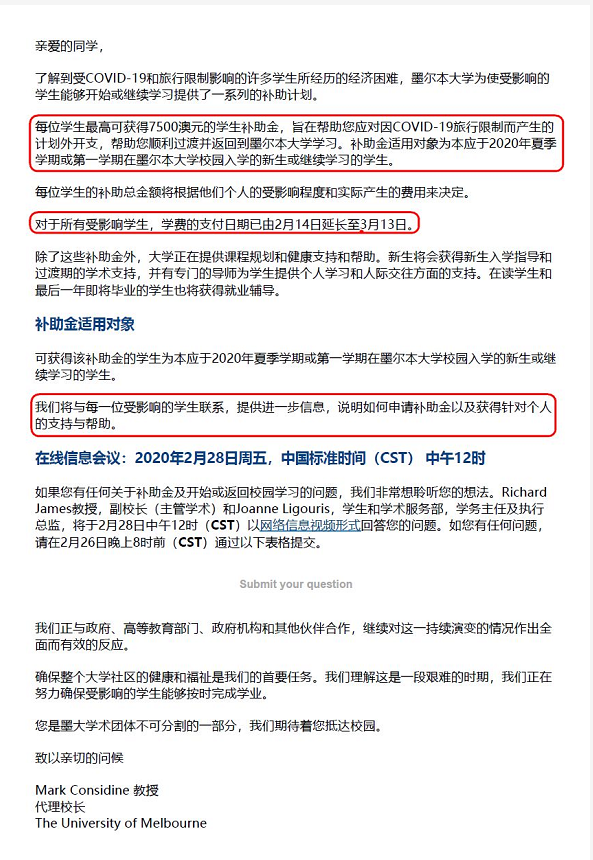“这项补助金旨在帮助学生应对因COVID-19旅行限制而产生的计划外开支,帮助学生们顺利过渡并返回到墨尔本大学的学习中。”
