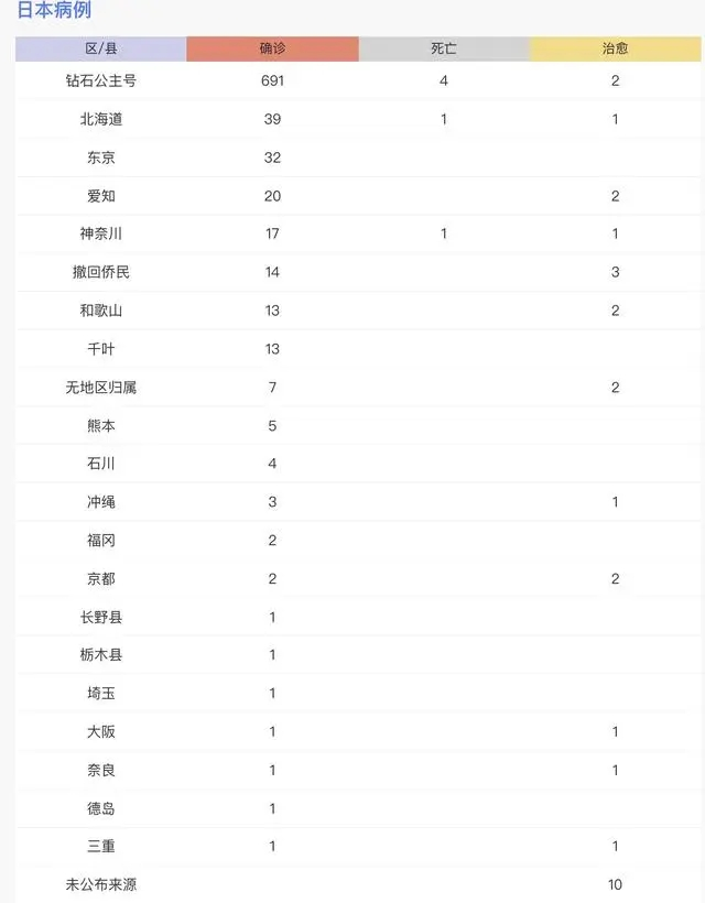 今天千叶县也增加了三例患者,2名是从“钻号公主号”下船回家的乘客,当时检测结果是阴性,现在被确诊阳性;另一名是当时在船上照顾乘客的一名医生,也已经被确认感染新冠病毒。截止到目前,日本全国确诊情况如下。