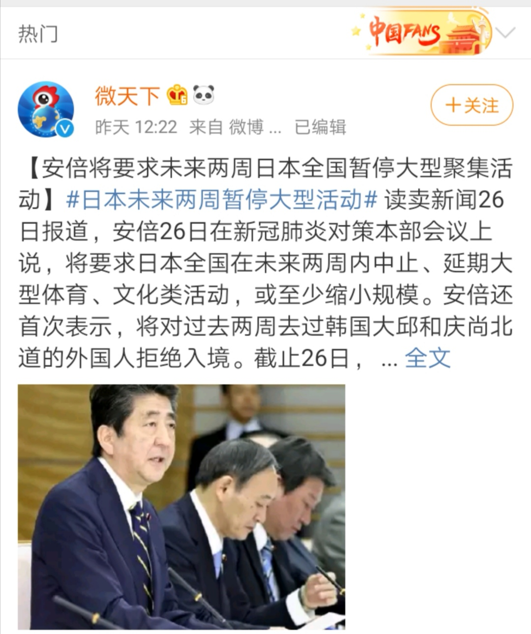 鉴于此,在今天的日本新冠疫情应对本部的会议上,安倍提出了希望之后一两周内举行的各种体育赛事等人群集聚的活动主办方对活动进行延期或者取消,或者缩小规模的提议。