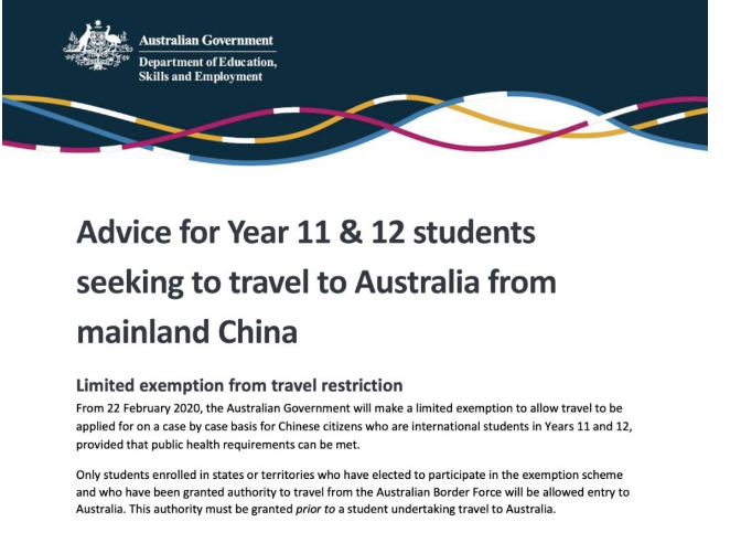从2020年2月22日起,在符合公共卫生要求的前提下,澳大利亚政府将对11、12年级的中国留学生给予有限度的豁免,根据个人情况决定是否允许入境。