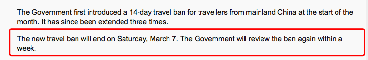 澳洲政府将中国大陆的旅行禁令延长至3月7日,之后每一周都会review, 这是政府第三次延长对非公民和永久居民的禁令。