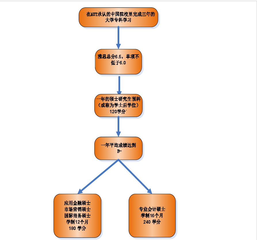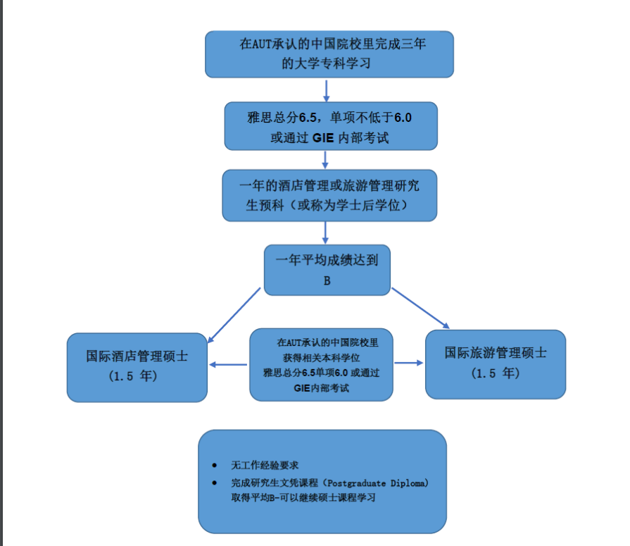 - 毕业于 AUT 认可中国院校的三年全日制大专生可以通过一年商学或者酒店旅游管理学士后文凭 (Grauate Diploma, 也叫研究生预科 ) 的学习,衔接 AUT 的商科专业硕士或国际旅游管理、 国际酒店管理硕士。