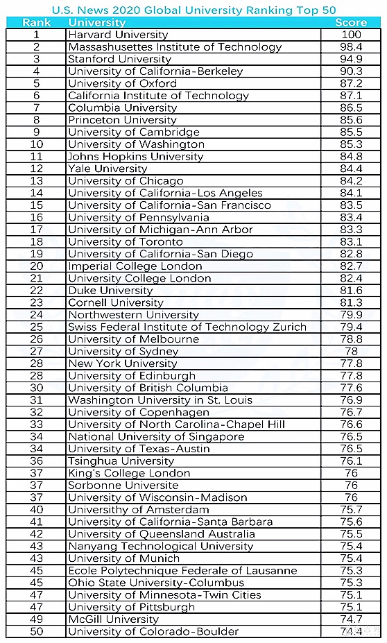 以下是今年 US News 世界大学排名的 Top 50 高校: