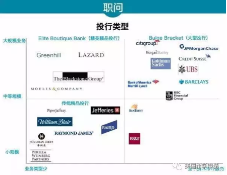 一般想要进入投行的小伙伴都以九大投行为目标,统称Bulge Bracket,包括:Golman Sachs,Morgan Stanley,JP Morgan,UBS,Creit Suisse,BAML,Barclays,Citi,Deutsche Bank。