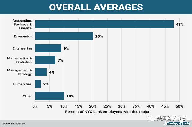 由此可见,如果想要去华尔街顶尖投行工作,那么学会计,商学和金融专业是不二选择。经济学作为基础学科,就业前景一直都很好,而且就业方向也比较广。学工程学和理学的同学也能分投行的一碗羹。当然,学文科的同学也不要气馁,也是有一定机会进入投行工作的,但是机会并不是特别大。