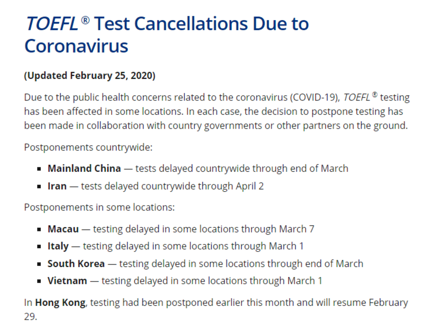 澳门&mash;&mash;部分地区取消托福考试至3月7日;