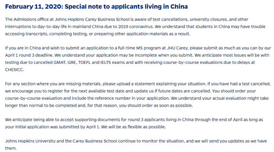 2 月 11 日约翰霍普金斯大学凯瑞商学院招生办公室发布了一条特别的关于中国大陆学生申请的通知,中国大陆学生可以在 4 月 1 日第三轮截止日期前提交申请,对于缺少的材料可在申请时向学校提交声明说明情况,并尽量在 4月底补交 。因为考试被取消的学生,建议注册下一个可用的考试日期,如果以后的日期被取消,及时更新。同时尽早进行成绩认证,出结果可能比正常延迟,但申请时可以附上你的编号,以便学校及时了解你的信息。下面是官网给出的具体信息: