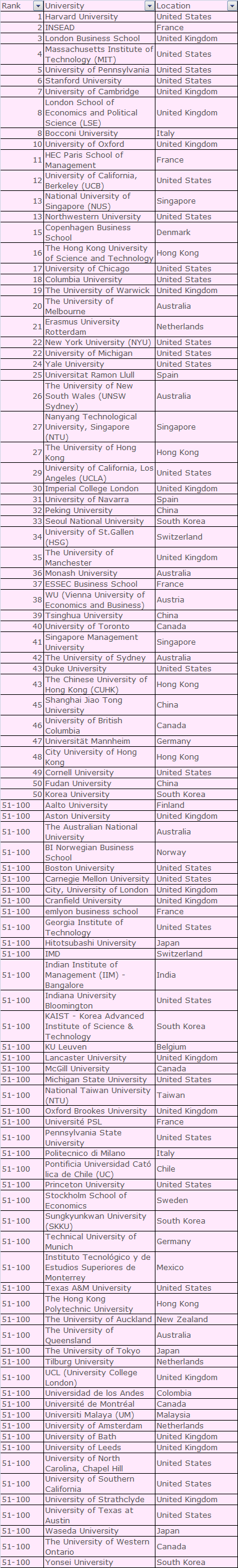 那么接下来,让我们一起来看一下QS2020年世界大学商业与管理研究排名,让我们来赶紧看一下前一百排名中有没有你喜欢的学校吧