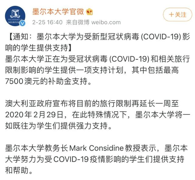 墨尔本大学为受冠状病毒(COVID-19)和相关旅行限制影响的学生提供一揽子支持,包括最高$7,500的资助。