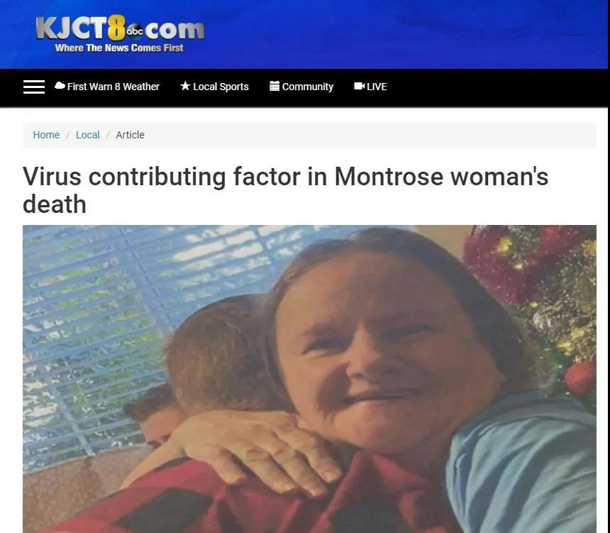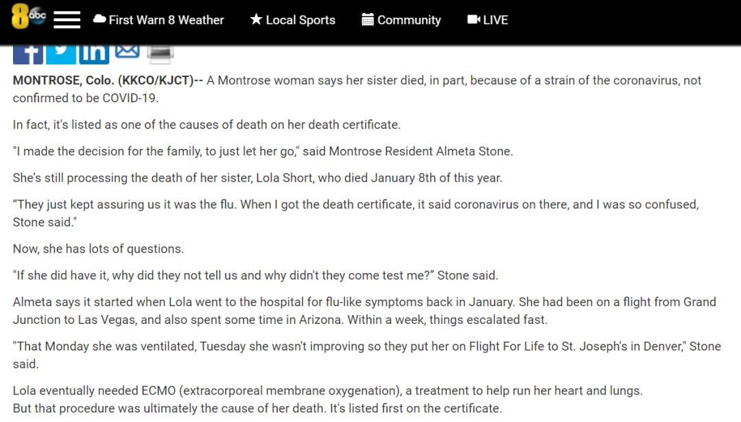 昨日, ABC新闻网下属的KJCT8新闻网报道 一名来自美国科罗拉多的女子斯通(Almeta Stone)向媒体爆料,她的姐姐1月8日去世之后, 她的报告上有一条死因是“感染冠状病毒”。