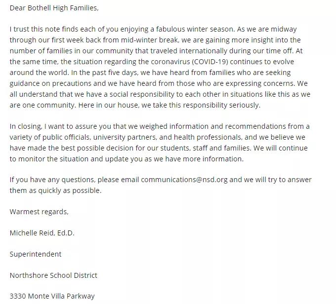 昨日,位于华盛顿州的博塞尔高中的学生家长突然收到了一封“停课通知”。