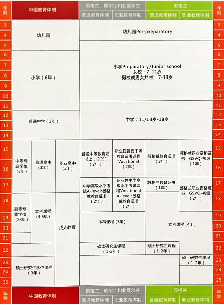 英国的教育体制已有数百年发展演化的历史,其教育体系可分为三种类型:小学(5至11岁),中学(11至18岁)和18岁以上教育(即高等教育)。苏格兰、威尔士和北爱尔兰的教育体制基本相同,而苏格兰则有自己的一套体系,主要区别在于所授予的学历资格不同。