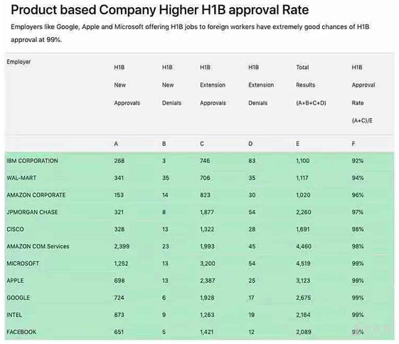 虽然公司的大小、信誉不会决定 H1B的通过率,但确实有一些影响。毕竟公司经营良好并且申请 H1B 时准备的材料充足有力,就会比较快通过,相对而言,要求补件的情况比较少。 比如这 一些公司的通过率就 非常高, 大部分是科技公司。