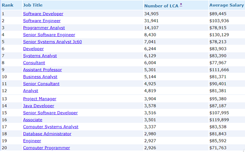 从全美排名前 20 的 H-1B 职位来看,平均年薪中位数超过 10万美金的岗位多集中于计算机、软件开发、电商、信息服务、和金融投资。