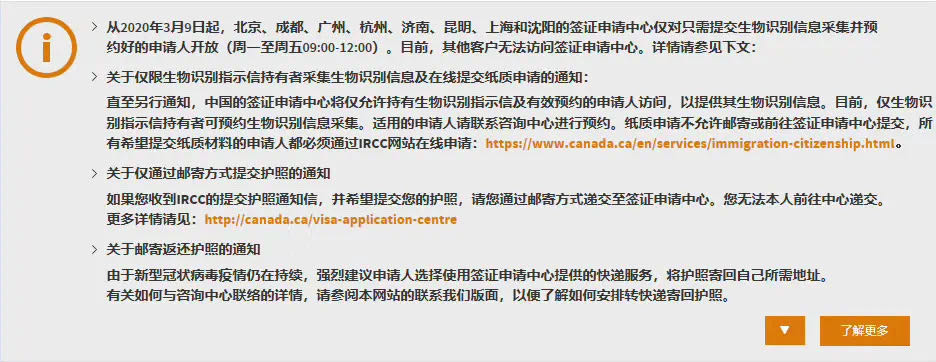 直至另行通知,中国的签证申请中心将仅允许持有生物识别指示信及有效预约的申请人访问,以提供其生物识别信息。目前,仅生物识别指示信持有者可预约生物识别信息采集。适用的申请人请联系咨询中心进行预约。纸质申请不允许邮寄或前往签证申请中心提交,所有希望提交纸质材料的申请人都必须通过IRCC网站在线申请.关于仅通过邮寄方式提交护照的通知