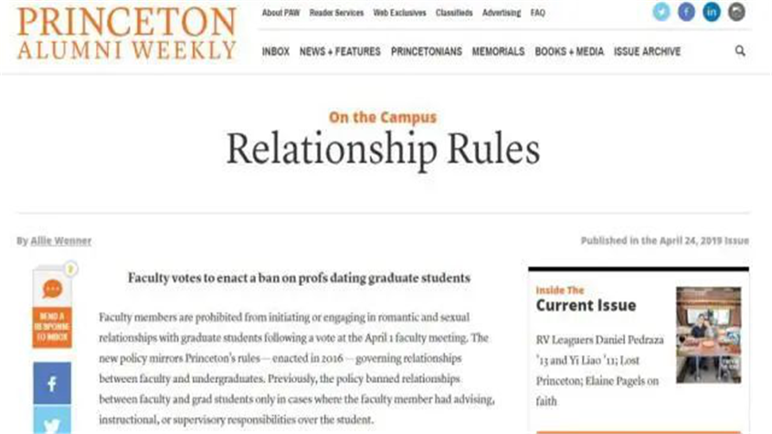 据了解,普林斯顿大学是在MeToo运动之后重新考虑了关于“师生恋”的政策,并在全校范围内要求更严格的指导方针,以防止教授对学生的权力过大,特别是在个人关系方面。