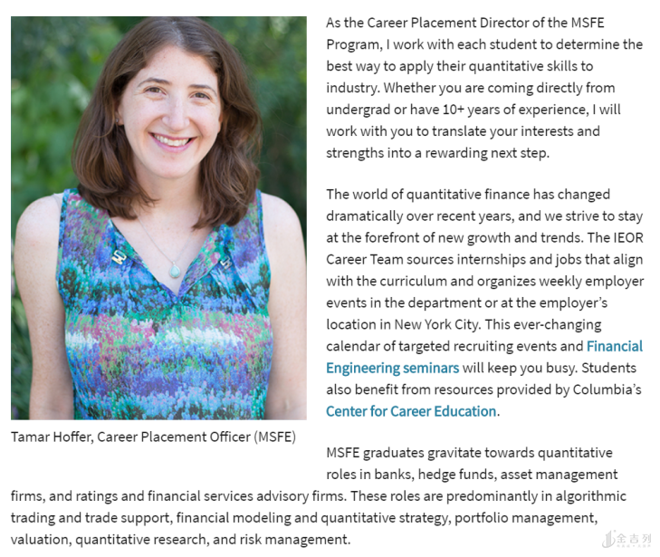 MSFE毕业生倾向于在银行,对冲基金,资产管理公司以及评级和金融服务咨询公司担任定量角色。这些角色主要在算法交易和贸易支持,财务建模和定量策略,投资组合管理,估值,定量研究和风险管理。