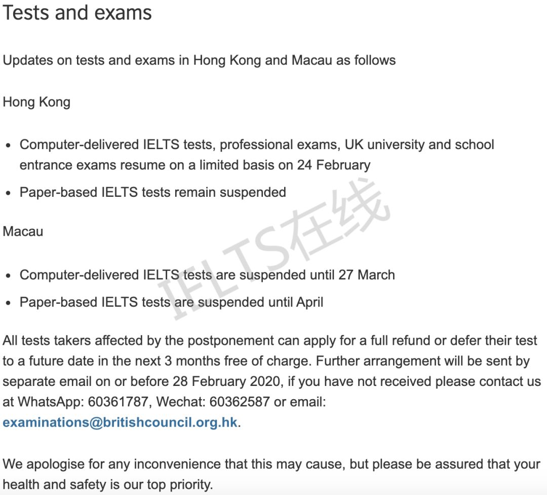 据英国文化教育协会消息:中国香港地区自2月24日恢复雅思机考,纸笔考试继续暂停;中国澳门地区自3月27日恢复雅思机考,纸笔考试继续暂停。