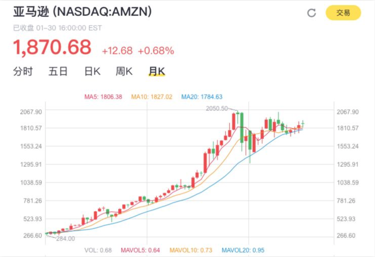 1月底, Amazon 发布了第四季度及全年财报。财报发布后, Amazon 盘后股票上涨12.68美元。