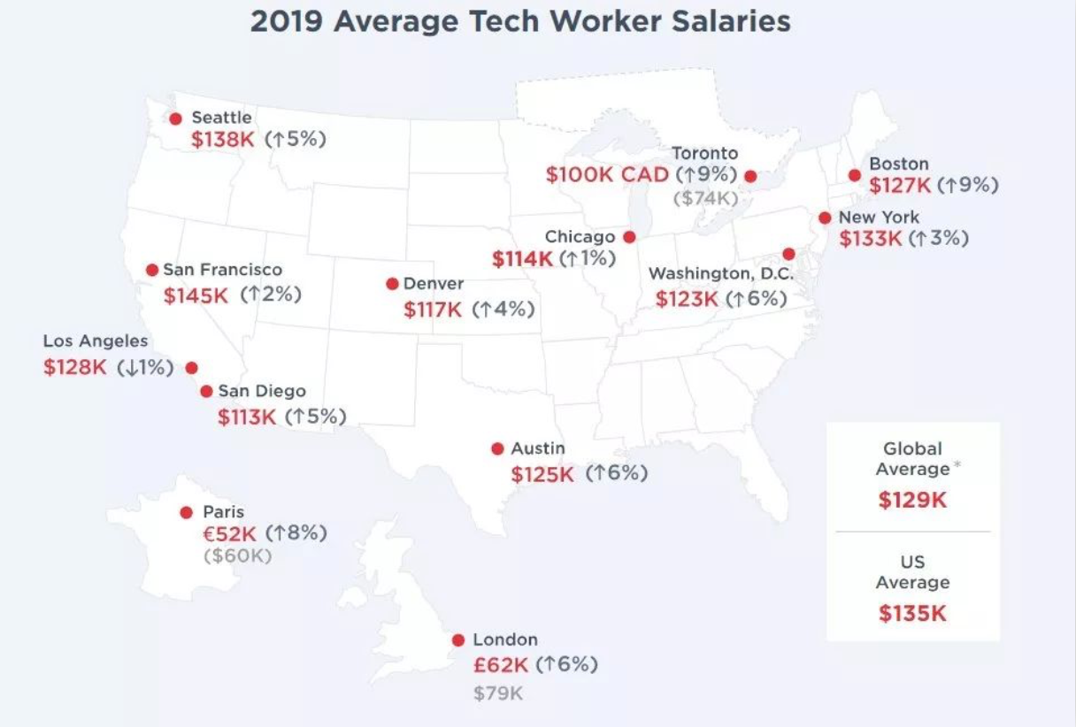 显而易见,主要城市的平均薪资都超过了年薪100K这个大关,整体也高于全球平均值。其中如LA,纽约,三藩等主要城市也超过了全球平均值。相比位于欧洲的伦敦和巴黎,美国Tech行业薪资也呈断崖式落差秒杀了它们。