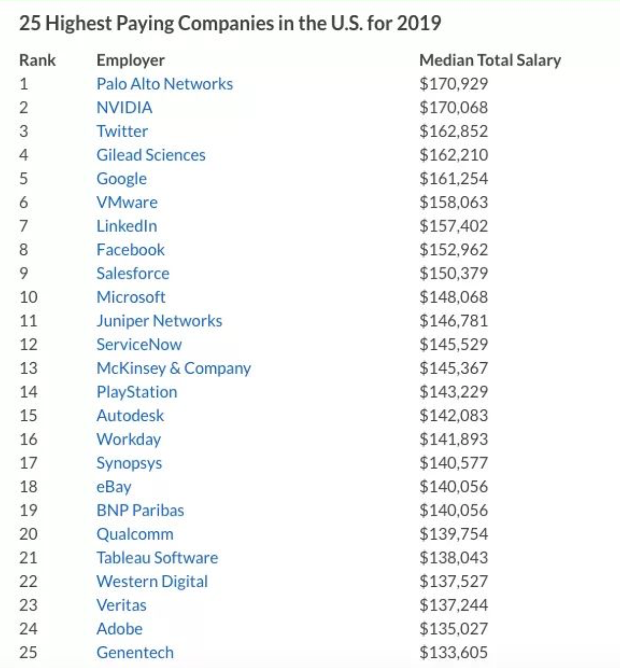 根据Glassoor的数据显示,不难发现榜单前10名的每家公司薪水中位数均在14.8万美元或以上。这25家公司中,位于 硅谷的科技公司 占据榜单上绝大部分的位置。