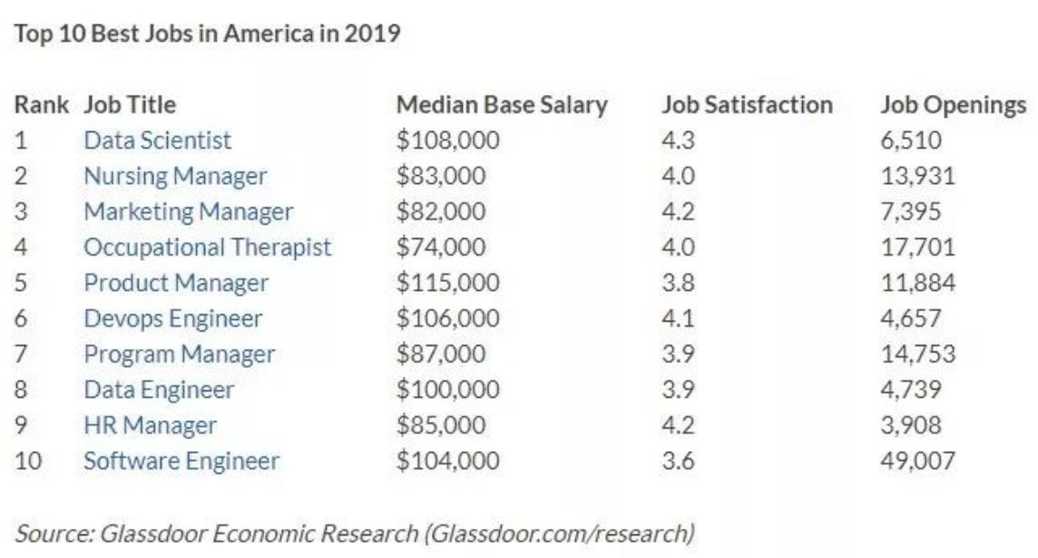 根据Glassoor对 2019年美国科技行业最佳工作的排名 ,我们可以清楚的看到占据第一位的是 Data Scientist ,无论是从薪资状况以及工作满意度来说,Data行业对求职者都是相当的有吸引力。