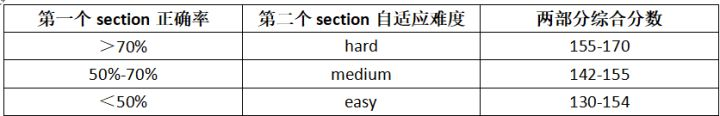 一般而言,所有的考生的第一个section的题目都是相同的而且为中等难度(meium)。第2个section有3种情况:easy, meium, har。考生第2个section遇到哪一种情况则取决于第一个section的答题情况。