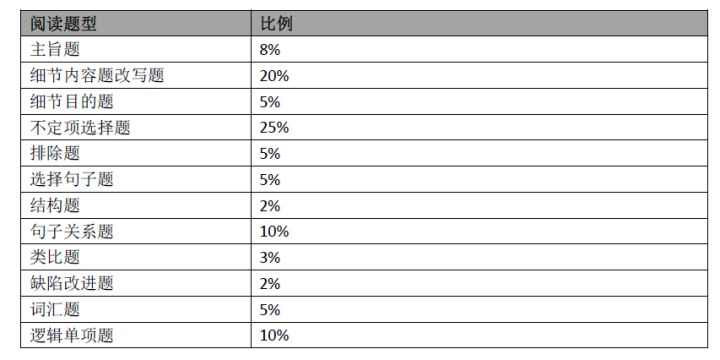 需要提醒的是,一方面,在一场考试中,有时候考生可能不会遇到下面的所有题型。这是因为GRE是自适应的考试,不同的考生做题情况不同,就会遇到难度不一样的题目。另一方面,下面这个比例只是笔者通过统计大量的GRE阅读真题后,得出的一个大概数字,并非是一个精确的比例。