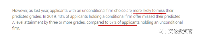 另外,英国招生机构UCAS报告显示,拥有无条件录取通知的申请人更有可能达不到预估成绩。