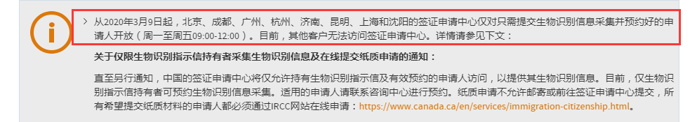 直至另行通知,中国的签证申请中心将仅允许持有生物识别指示信及有效预约的申请人访问,以提供其生物识别信息。目前,仅生物识别指示信持有者可预约生物识别信息采集。适用的申请人请联系咨询中心进行预约。纸质申请不允许邮寄或前往签证申请中心提交,所有希望提交纸质材料的申请人都必须通过IRCC网站在线申请:https://www.canaa.ca/en/services/immigration-citizenship.html。
