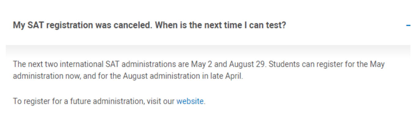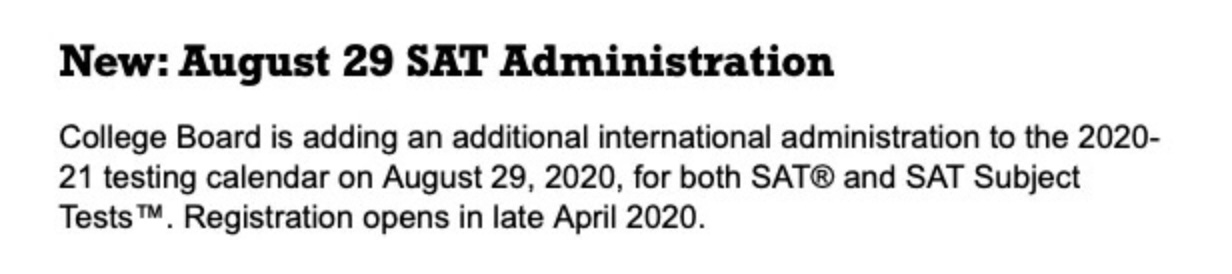 虽然当时官方发送给考生的邮件中有提到过8月份的考试,但此前8月只有美国考场,国际考场还只在计划中没有挪动位置, 此次发布最新消息确认了国际考场。8月29日也有考试啦!而且SATI和SATII都有哦~