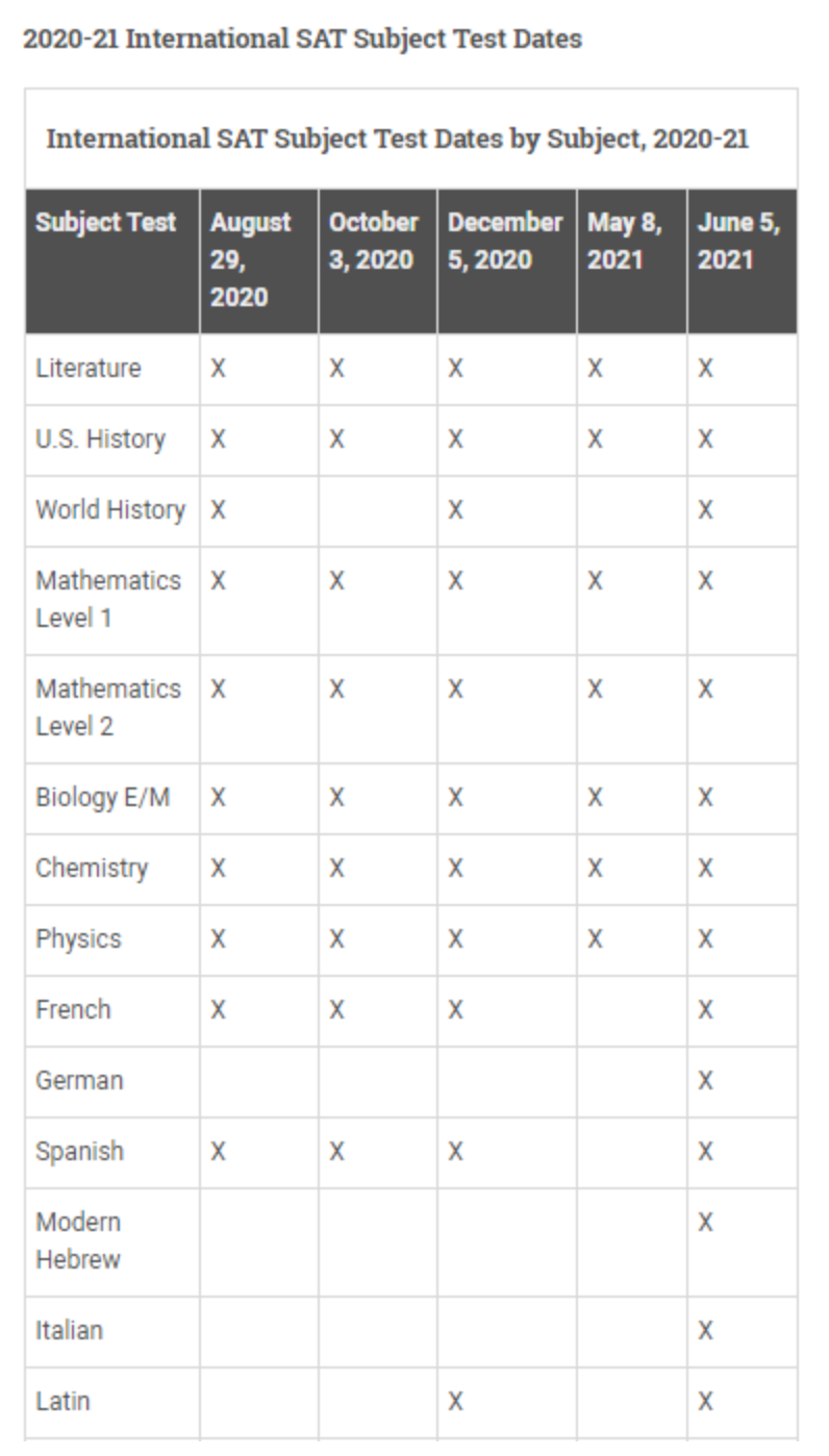 下图第二竖列为八月考试国际考场SAT subject可考科目