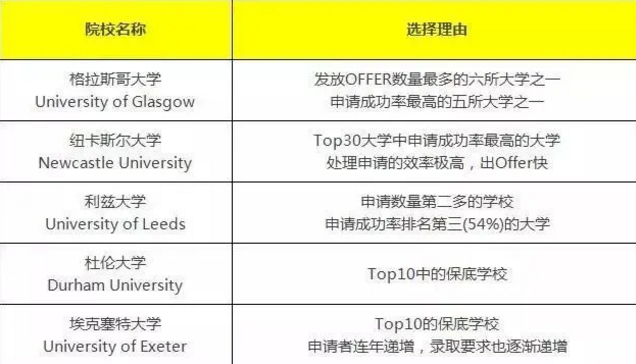 比如选专业水平较高但综合排名不太靠前的学校,或选地理位置偏一点的,像苏格兰、威尔士、北爱尔兰地区,相对英格兰中部地区的学校会好录取一些。对于学商科的同学,苏格兰的八大高校,格拉斯哥、爱丁堡、斯特拉斯克莱德大学、斯特林、圣安德鲁斯等都可以考虑。
