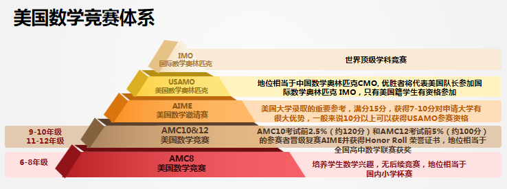 AMC是American Mathematics Competition是美国数学竞赛的缩写,由美国数学协会(Mathematics Association of America)于1950年成立。试题由简至难兼具,使任何程度的学生都能参与其中,同时也能让任何程度的学生都感受到挑战。AMC是世界上目前信度和效度最高的数学科试题。