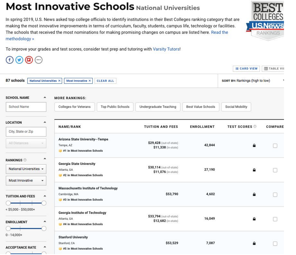 无比在意创新的美帝大学经常举办各种创新项目和活动来培养学生的创新精神。因此,innovation是衡量大学核心竞争力的重要指标之一!近日,最具公信力的U.S.NEWS公布了全美最具创新能力的大学排名,U.S.NEWS根据美国大学的创新项目数量以及质量等多项条件进行排名,为大家评出全美最具创新能力的美国大学榜单。