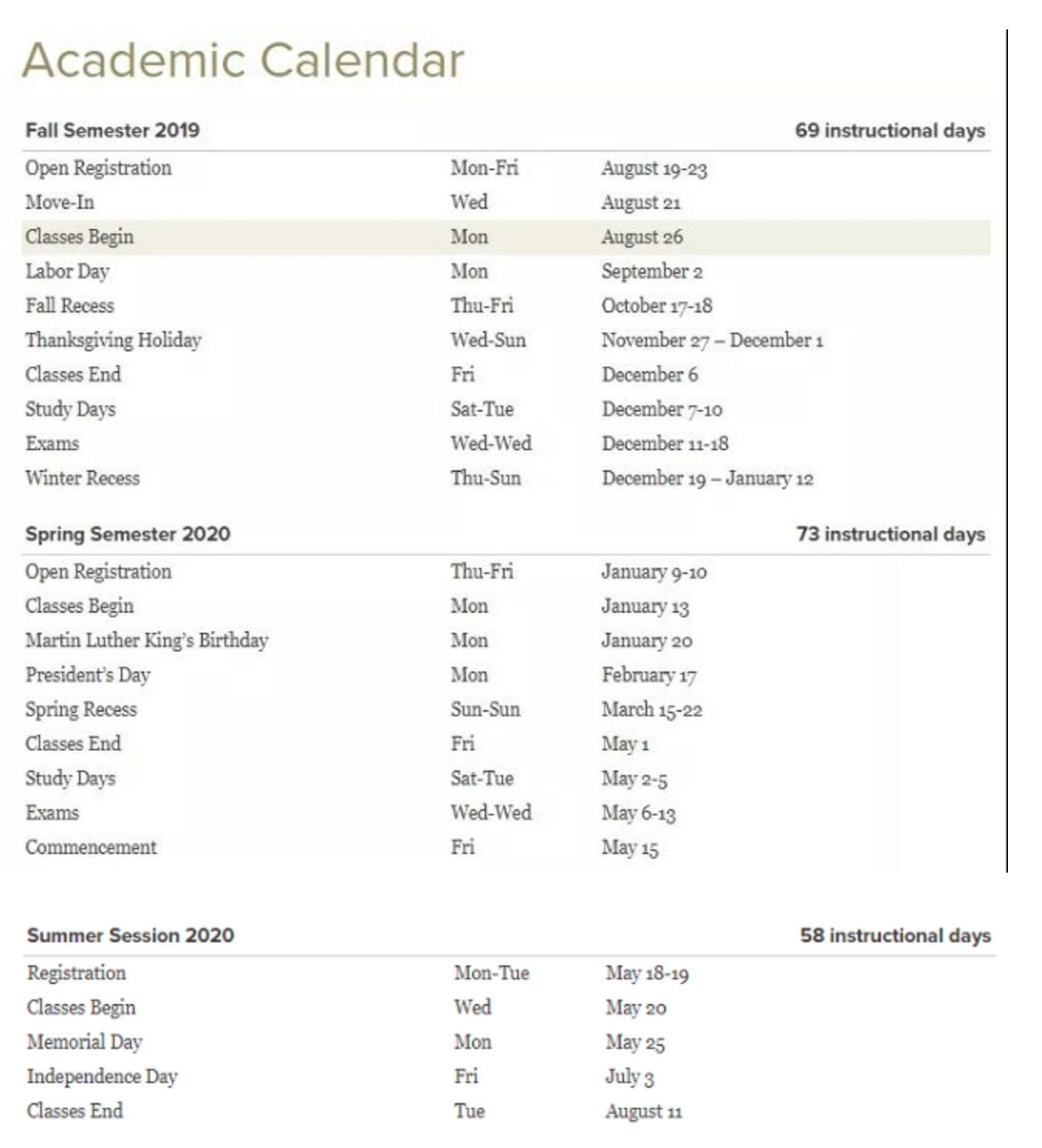 两个学期制:一年分为上学期(春季)、下学期(秋季)。第一学期从八、九月到十二月,第二学期从一月到五月,每一学期约十八周。暑假期间可以自由选修课程。