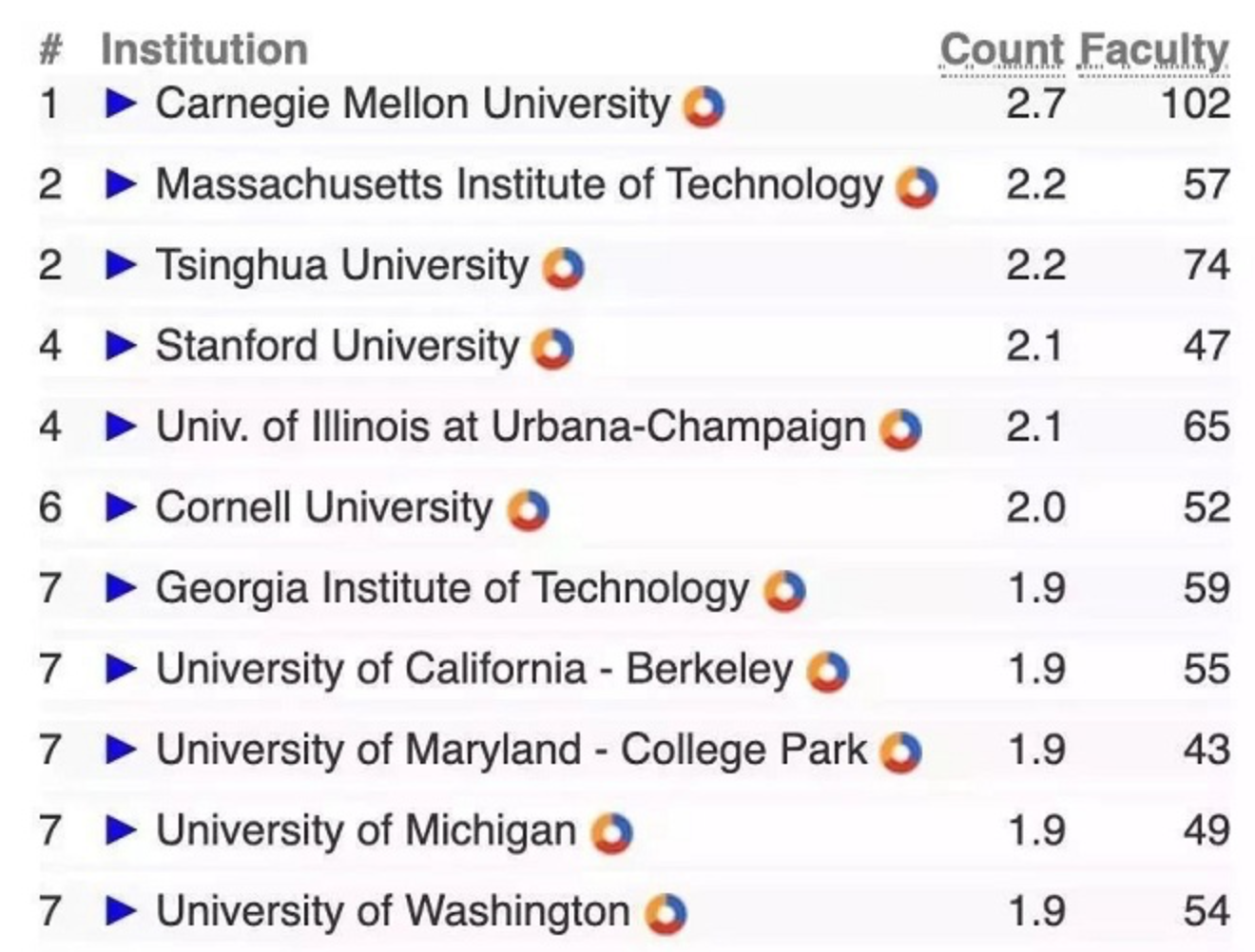 据榜单显示,有11所名校入围全球前十名,其中有10所美国院校、1所来自中国的院校——清华大学。CS专业排在全球第一位的是美国的卡内基·梅隆大学。