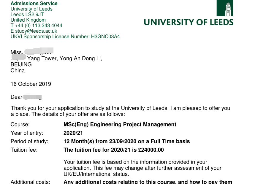 赶着学校开放就马上递交出申请,功夫不负有心人,四周后就拿到了梦寐以求的利兹大学录取。
