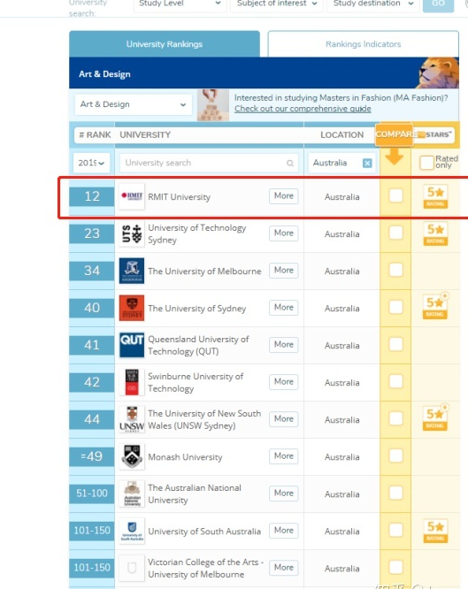 2019年世界QS Art & Design专业排名中,皇家墨尔本理工大学位居世界第12,全澳第一。