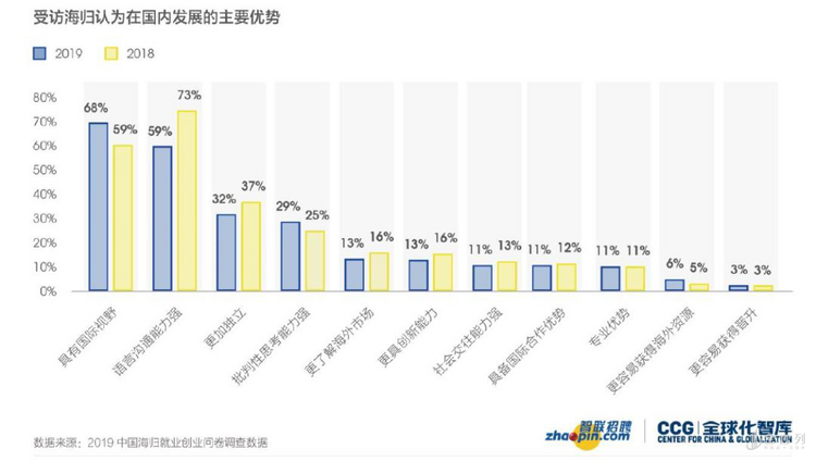 在留学生普遍增加的趋势下,留学生有哪些优势,又要弥补哪些不足呢?全球化智库和智联招聘相关问题做了调查。