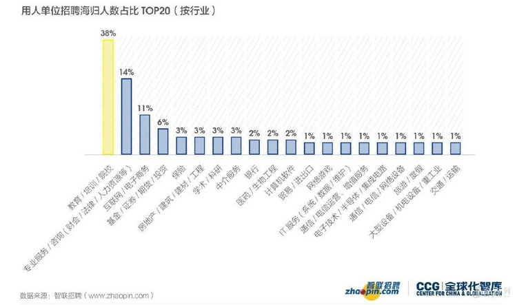 根据《2019 中国海归就业创业调查报告》,教育培训行业对海归的需求最高,占所有行业招聘人数总数的38%;专业服务/咨询(财会、法律、人力资源等)的需求排第二,占14%;互联网/电子商务的行业需求占11%。