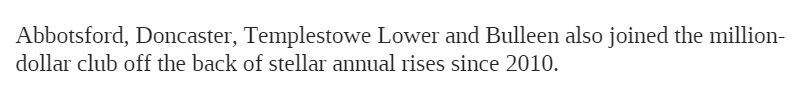 报道称,自2010年以来,Abbotsfor、Doncaster、Templestowe Lower和Bulleen凭借每年的强劲增长,纷纷也加入了百万澳元俱乐部。