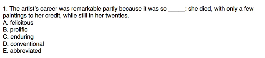 我们注意一下,to her creit就是她值得称道的..., 这里的意思就是在她名下的名作仅仅有几幅。还有一个点大家要注意的是这句话中有个“:”,冒号后面的内容都是在解释because后面it was so ( )的内容。这个要选择的单词和后面she ie开始到最后的内容是表达一个意思。那么我们能够感觉到是在说这个艺术家的一生能留下来的仅仅有一些画作,产量不多,而且其个人也是寿数不长,再回归5个选项,显然E是最合适的,有简短的意思在里面。