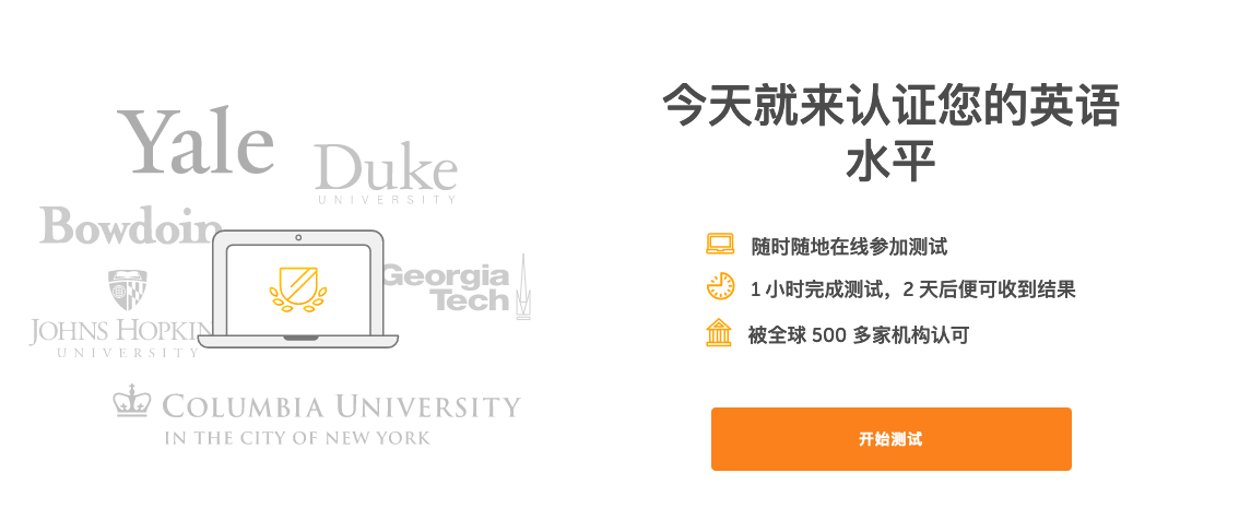 打开多领国考试的官网,你会看到这样一个界面。你可能可以认出大学的名字,是的,多邻国考试已经被全球500多家机构认可。