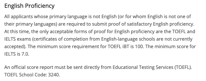 我们具体看一下要求,除了常规的推荐信3封、成绩单、GRE等,托福要求是100.GRE虽然没有具体要求,但是根据往年的申请经验来看一般是在320+左右的成绩比较保险。