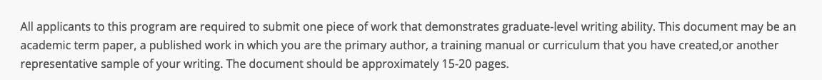 另外博士申请还要求Writing Sample,其实就是平时以论文形式在学校内完成的作业等。这个项目具体的要求是15-20页的小论文。