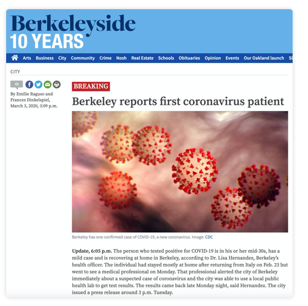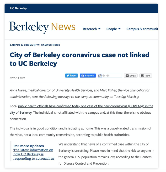 自三月初起,新冠肺炎在全球各地开始以不同规模爆发。 在今天,UC Berkeley所在的加州湾区伯克利市出现了 第一个确认的新冠肺炎的感染病例 。